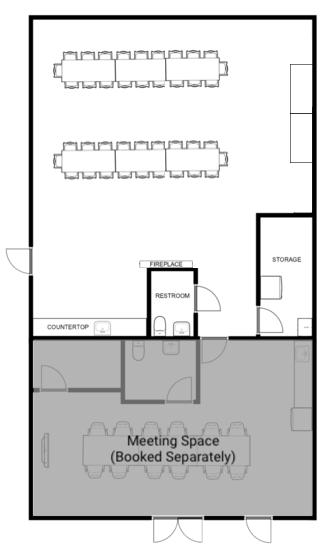 *The three circles displayed on some diagrams are standing cocktail tables. Renters typically use 1-2 of our 6ft tables for food/buffet station and the south countertop (with a sink) for the wet bar for beverages. If you need more space, we recommend adding the conference room to your booking which serves as a good area for food and provides an additional bathroom and kitchenette.